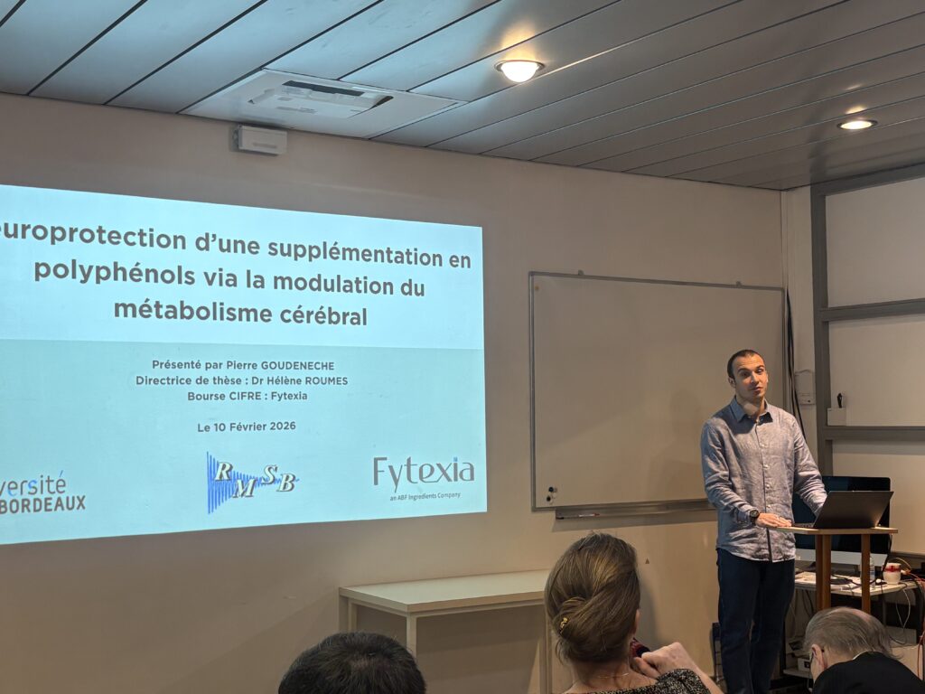 M. Goudeneche a présenté sa thèse intitulée : « Neuroprotection d’une supplémentation en polyphénols via la modulation du métabolisme énergétique cérébral ». Il a su retracer ses contributions dans ces recherches menées de longue haleine par l’équipe MetaPat. Ces travaux, réalisés dans le cadre d’une recherche en supplémentation nutritionnelle pour préserver les fonctions cognitives du nouveau-né souffrant d’hypoxie ischémie ont soulevé des questions intéressantes.
